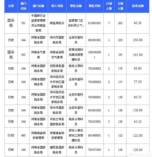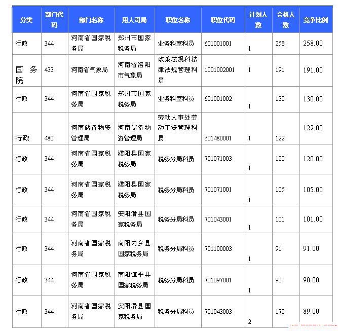 截止22日8時,招錄比例最高的職位河南省國家稅務局鄭州市國家書稅務局下業務科員一職,招錄1人,截止22日8時通過人數為258人。