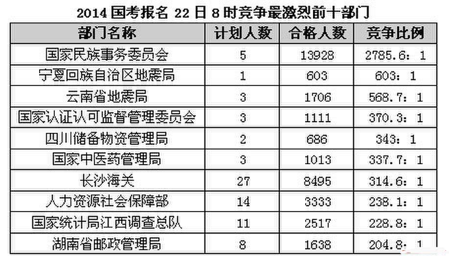 國家民族事務委員會以2785.6:1的絕對優勢排在首位,該部門歷來是最難考的部門,考生們要謹慎選擇。