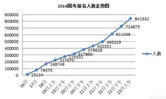 2014年國家公務(wù)員考試報名八天以來,人數(shù)不斷攀升,今日更是超過80萬大關(guān),通過走勢圖可明顯看出具體歷程: