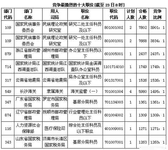 截止到23日8時,共有13個職位的競爭比例超過1000:1。國家民委兩個職位仍然以絕對優勢占據“雙榜”首位,并且極有可能在下午的數據中突破4000:1的競爭比大關。一邊是大熱,一邊仍“無人問津”,據統計,目前仍有249個職位無人通過審核,占總職位數的2%。
