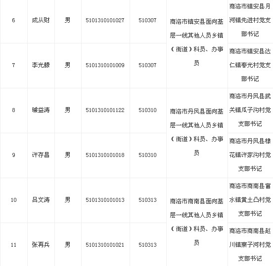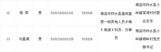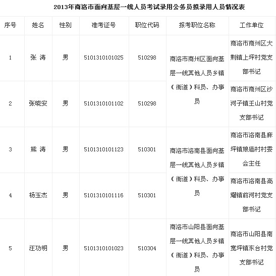 根據《2013年陜西省從優秀工人農民中考試錄用公務員工作公告》有關要求,經推薦報名和筆試、面試、量化考察、體檢等程序,擬錄用下列同志為商洛市面向基層一線其他人員職位公務員,現予以公示,歡迎社會各界廣泛監督。如有異議,可直接向商洛市委組織部或省委組織部公務員管理處反映。
