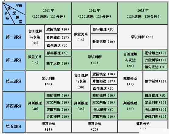 2011-2013年下半年四川公務員錄用考試行測題型題量分布
