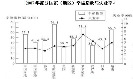 【解析】C。國民生產總值小于1000億美元為哥斯達黎加、多米尼加、越南,幸福指數均高于其他國家,A項正確;比中國內地失業率低的國家為韓國和日本,幸福指數均低于中國內地,C項正確。