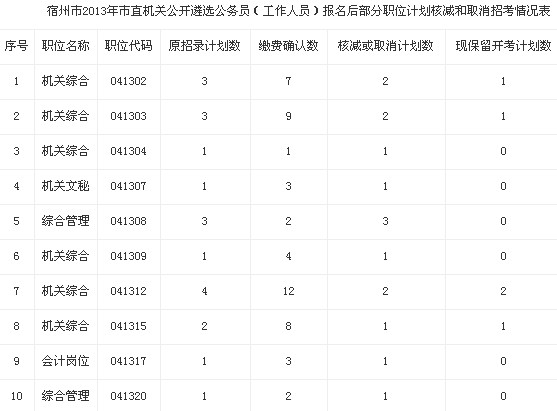 根據《宿州市2013年市直機關公開遴選公務員(工作人員)公告》規定,以及報名確認等情況,經審定,現將報名后達不到規定開考比例的部分職位計劃核減或取消招考的情況予以公布(具體見附表)。其中,職位取消招考的原報考人員,按規定可于11月5日9:00―16:00在宿州人事考試網上改報考符合條件要求的其他職位。請職位取消招考的原報考人員及時做好改報考有關工作。