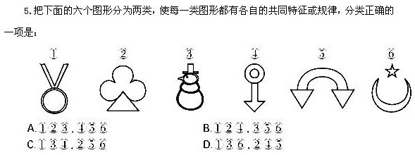 5.【答案】D。解析:給出的六個圖形差異較大,排除數量性考點,考慮圖形的構成特征。觀察發現圖形中均含有直線和曲線,進一步分析圖形中直線與曲線的位置關系,①③⑥中直線位于曲線上方,②④⑤中直線位于曲線下方。
