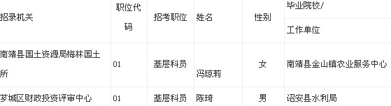 根據《公務員錄用規定(試行)》和《福建省2012年度秋季考試錄用公務員工作實施方案》的要求,在筆試、面試、體檢和考察的基礎上,擬錄用以下同志為公務員或參照管理工作人員。現向社會予以公示。公示期間,如有問題,請及時向漳州市公務員局職位管理與考錄科反映。