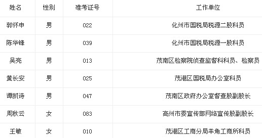 根據《公務員公開遴選辦法(試行)》的有關規定,經過筆試、面試、體檢、考察和市紀委常委會研究等程序,擬任郭懷申、陳華鋒、吳亮、黃長安、譚凱詩、周秋云(女)、王敏(女)等7名同志為茂名市紀委監察局公務員,現予以公示。如對擬轉任人選有異議或有其它問題,請向茂名市紀委監察局干部室反映。
