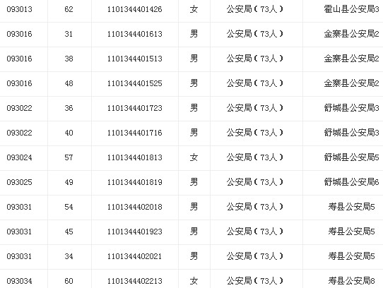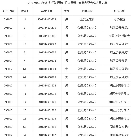2013年安徽省六安市政法干警遞補體測合格名單公告