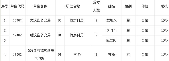 根據中共中央組織部、中華人民共和國人事部印發《公務員錄用規定(試行)》(國人部發〔2007〕134號)和省委組織部、省公務員局《關于印發〈福建省2013年度考試錄用公務員工作實施方案〉的通知》(閩人發〔2013〕30號)等文件精神,擬錄用通過統一組織考試、心理測試、體能測試、體檢、考察合格的黃旭東等4位同志為公務員,現予以公示。公示時間為2013年11月15日至2013年11月21日。0598-8222341(政府);來信投遞:三明市公務員局考試錄用職位管理科(郵政編碼:365000);來訪來電時間:正常工作時間;接待科室:三明市公務員局考試錄用職位管理科。