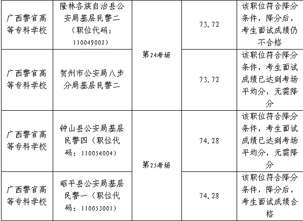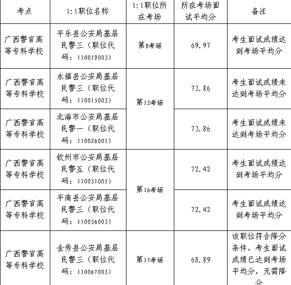 根據(jù)廣西壯族自治區(qū)2013年度政法干警招錄培養(yǎng)體制改革試點(diǎn)招考公告中“報(bào)考計(jì)劃錄取人數(shù)與實(shí)際面試人數(shù)比例為1:1職位的人員,其面試成績(jī)要達(dá)到當(dāng)天所在考官組面試的所有人員的平均分以上(含平均分)且不得低于60分,方為合格。經(jīng)自治區(qū)公務(wù)員主管部門批準(zhǔn),報(bào)考少數(shù)民族艱苦邊遠(yuǎn)地區(qū)和緊缺職位的人員,其面試合格分?jǐn)?shù)線可在考場(chǎng)平均分的基礎(chǔ)上降低5分,但不得低于60分。”的規(guī)定,現(xiàn)將2013年公安系統(tǒng)招錄培養(yǎng)體制改革試點(diǎn)報(bào)考計(jì)劃錄用人數(shù)與面試人選的比例在1:1以下(含1:1)職位所在考場(chǎng)面試平均分公布如下:
