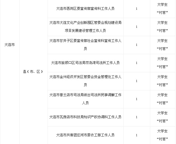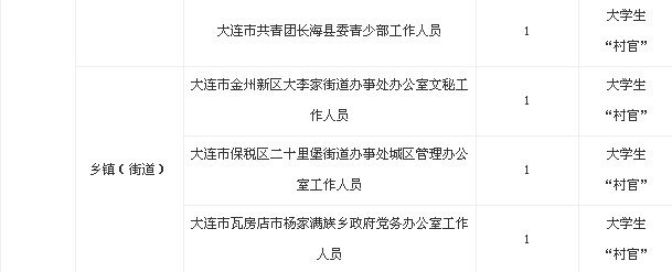 本次大連市從大學生“村官”和優秀村(社區)黨組織書記中共定向招錄市縣鄉機關公務員44名,其中,從大學生“村官”中定向招錄市縣鄉機關公務員20名,從優秀村黨組織書記中定向招錄鄉鎮機關公務員9名,從優秀社區黨組織書記中定向招錄街道機關公務員15名。具體招考崗位如下: