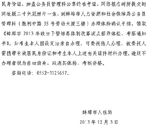 摘要 2013年安徽省蚌埠市政法干警體檢時間為12月7日。