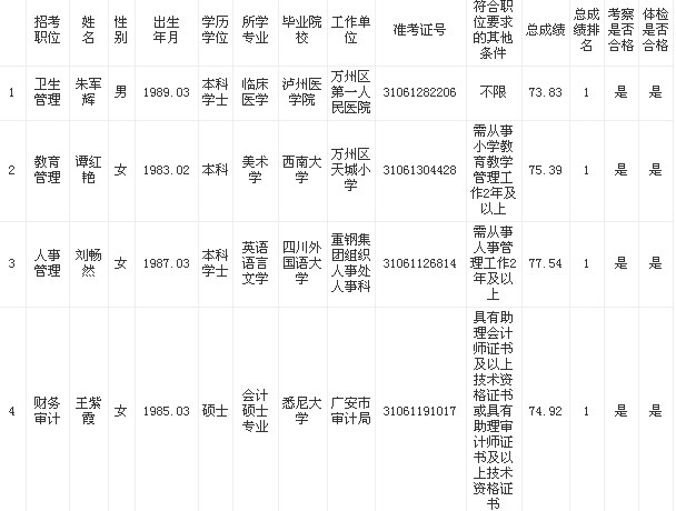 按照中共重慶市委組織部、重慶市人力資源和社會保障局、重慶市公務員局《2013年下半年面向社會公開考試錄用公務員》的公告要求,現將擬錄用公務員予以公示。