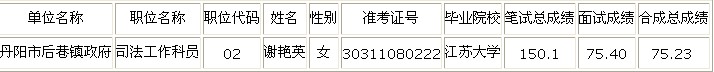 根據國公考錄函〔2009〕07號文件,報考丹陽市后巷鎮政府的謝艷英同志,因懷孕暫緩錄用。現經過筆試、面試、體檢和考察(政審)等規定程序,符合公務員錄用條件,擬予錄用。公示時間為2014年01月13日至01月19日。監督電話:0511-85340500。