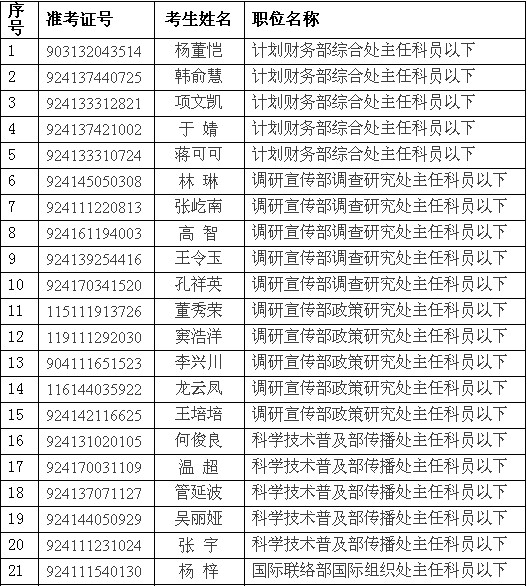 中國科協機關2014年度錄用計劃為7名。計劃錄用人數與參加專業科目考試和面試考生比例為1:5。按照各職位筆試成績從高到低的順序確定人選。各職位最低分數線為: 計劃財務部綜合處主任科員以下職位110.9分,調研宣傳部調查研究處主任科員以下職位118.3分,調研宣傳部政策研究處主任科員以下職位112.1分,科學技術普及部傳播處主任科員以下職位120.9分,國際聯絡部國際組織處主任科員以下職位120.5分,國際聯絡部雙邊合作處主任科員以下職位119.5分,國際聯絡部綜合處主任科員以下職位112.9分。報考調研宣傳部和國際聯絡部有關職位的考生需進行專業科目考試。具體名單如下: