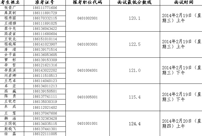 我辦2014年度公務員招考面試擬定于2月19日―20日舉行,參加上午面試的考生,請于面試當日8:30前到候考室報到,截止到8:50未報到人員視為自動放棄面試資格。參加下午面試的考生,請于面試當日13:00前到候考室報到,截止到13:20未報到人員視為自動放棄面試資格。請考生攜帶身份證、公共科目筆試準考證、學歷學位證書、英語等級證書或成績單等相關材料的原件。