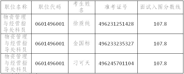 參加面試人數與錄用計劃數比例達到3:1及以上的,面試后按綜合成績從高到低的順序確定體檢人選;比例低于3:1的,考生面試成績須達到60分,方可進入體檢。我辦將以電話方式通知考生本人,并組織前往指定醫(yī)院進行體檢,體檢通過后進入考察,考察人選按照錄用人數1:1的比例確定。體檢時間地點另行通知,體檢費用由我辦承擔。