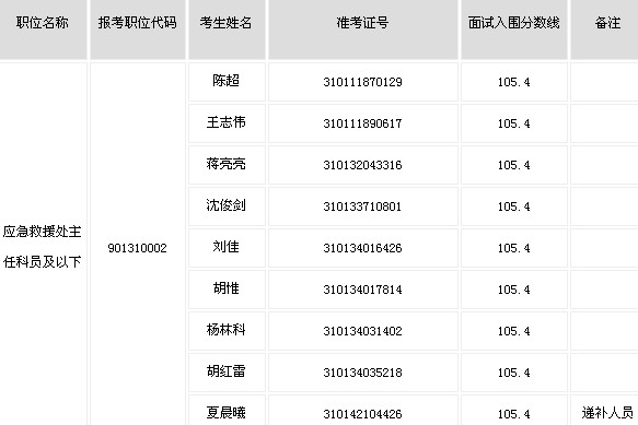 注:1.因楊曉婕(準考證號310111301109)、姜?鵬(準考證號310111801508)2名考生放棄面試資格,按照筆試成績從高到低的順序,遞補夏晨曦(準考證號310142104426)參加面試。