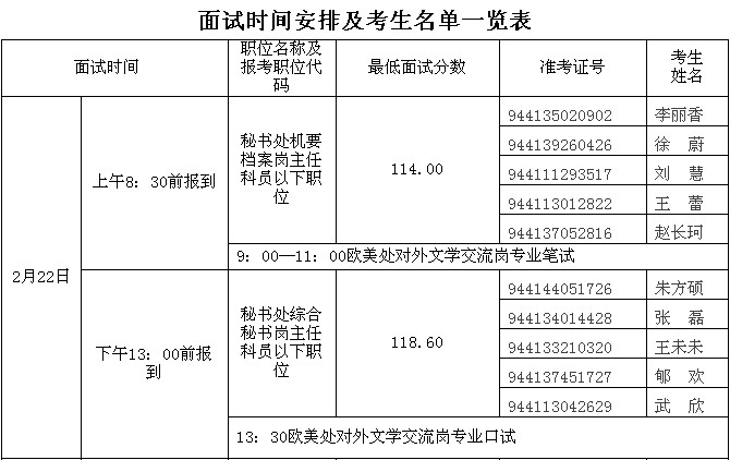 根據考生公共科目筆試成績從高到低的順序,按照規定面試比例1:5確定各職位參加面試人員。面試安排在2014年2月22日、2月23日兩天,請考生務必按照報到時間提前到達候考室(中國作家協會機關7樓會議室),進行面試順序抽簽和資格審查,未按時進入候考室的考生,取消面試資格。考生實行封閉化管理。