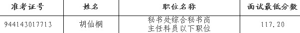 由于進(jìn)入面試人選因個(gè)人原因放棄面試資格,根據(jù)中組部、國(guó)家公務(wù)員局關(guān)于公務(wù)員招考面試工作的有關(guān)規(guī)定,我會(huì)在公共科目筆試成績(jī)合格考生中,按照成績(jī)由高到低的順序進(jìn)行遞補(bǔ)。遞補(bǔ)人員名單如下: