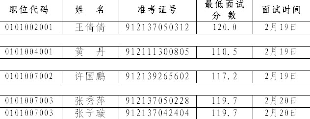 試資格,根據(jù)中央組織部、人力資源和社會(huì)保障部、國(guó)家公務(wù)員局關(guān)于2014年度公務(wù)員錄用工作的有關(guān)規(guī)定,擬在公共科目筆試合格的考生中,按照公共科目筆試成績(jī)從高到低的順序遞補(bǔ)4個(gè)職位的5名考生進(jìn)入面試名單,并相應(yīng)調(diào)整這4個(gè)職位面試最低分?jǐn)?shù)線,現(xiàn)公告如下: