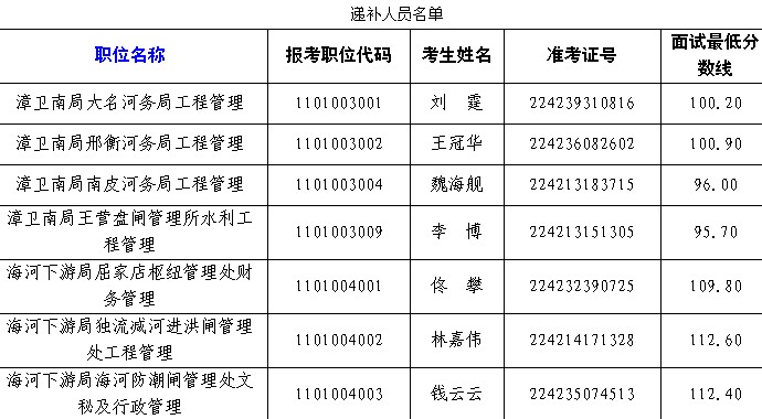 因部分考生自愿放棄面試資格,根據公務員考試錄用工作有關規定,在公共科目筆試合格考生中按照筆試成績從高到低遞補進行遞補,請遞補人員按照《水利部海河水利委員會2014年考試錄用公務員面試公告》相關要求做好面試準備工作。