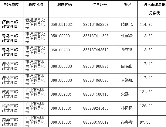 由于部分考生個人自愿放棄面試資格、資格預審未通過等原因,根據中央機關及其直屬機構考試錄用公務員的有關規定,按公共科目筆試成績由高到低的順序,確定以下8人遞補參加2014年度山東省郵政管理局公務員招錄面試。