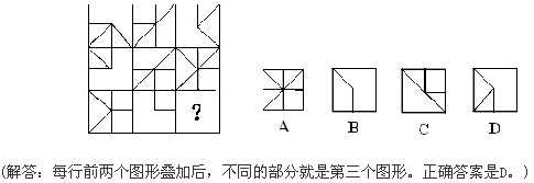 第一種題型:圖形推理。每道題給出一套或兩套圖形,要求報考者認真觀察找出圖形排列的規律,選出符合規律的一項。