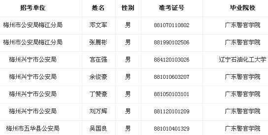 2013年廣東省梅州市考錄公務員調劑擬錄用名單公示