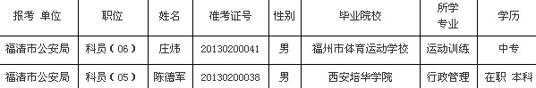現將福清市公安局2013年度面向特殊技能人才考試錄用人民警察擬錄用人員名單予以公示。公示時間為2014年2月25日至2014年3月3日。公示期間歡迎群眾來電、來信、來訪反映情況。公示電話:0591-83335789;來信投遞:福州市公務員局考試錄用和職位管理處(郵政編碼350001);來訪來電時間:正常工作時間;接待處室:福州市公務員局考試錄用和職位管理處。
