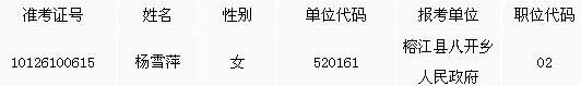 根據《貴州省2013年省、市、縣、鄉四級機關統一面向社會公開招考公務員和選調高校優秀畢業生到基層工作簡章》規定,經筆試、面試、體檢、考察政審合格,楊雪萍同志擬錄用為我州公務員,現予以公示。