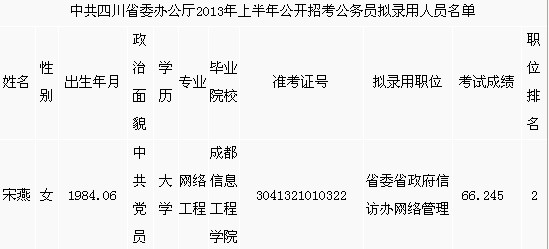 根據《關于2013年上半年省直機關和垂管系統公開考試錄用公務員的公告》和省委辦公廳招考簡章的規定,經考試、體檢、考察,研究確定宋燕同志為省委省政府信訪辦擬錄用人員,現予以公示(名單附后)。