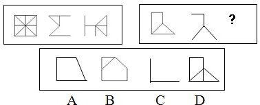 解答:正確答案為C。因為在第一套圖形中的后兩個圖形疊加在一起正好合成第一個圖形;在第二套圖形中的問號處如果為C項則與第一套圖形的規律一致。