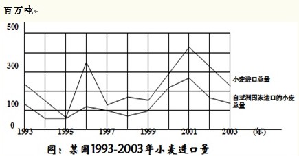 1.從1993年到1997年中,該國共從亞洲國家進口多少小麥(百萬噸)?
