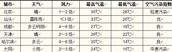 城市天氣風力最高氣溫最低氣溫空氣污染指數