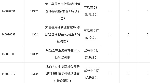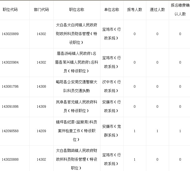 截止3月22日,2014年陜西公務員考試職位報名統計,最冷職位:太白縣太白河鎮人民政府財政所科員財務管理(特設職位),報考人數0人,通過人數0人,繳費人數0。具體情況如下: