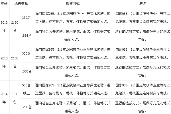 從公告中可知,全省共選聘大學生村官1700名左右。其中,面向國家985、211重點院校畢業生等擇優選聘500名左右;面向社會公開選聘1200名,相比2013年選聘2100名,人數減少了400名;繼續實行擇優選聘和公開選聘兩種選拔方式并存,2014年擇優選聘人數居歷年之最;(詳見下表)