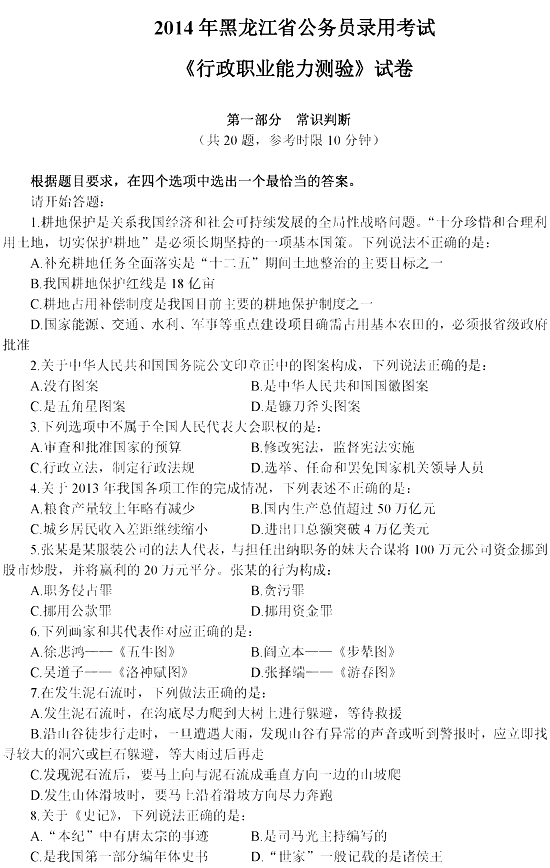 2014年黑龍江省公務員考試行測真題:常識判斷