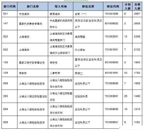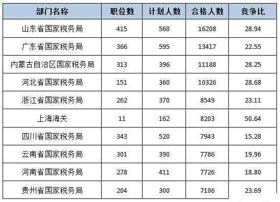 在參與招錄的490個(gè)部門中,山東省國家稅務(wù)局審核通過的人數(shù)仍位居榜首,已過審16208人;內(nèi)蒙古儲(chǔ)備物資管理局職位的競爭最為激烈,招錄2人,過審1004人,平均競爭比達(dá)502:1。