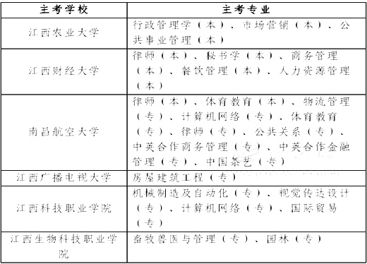 此外,今年江西有6所學(xué)校獲批增設(shè)部分高等教育自學(xué)考試本(專)科主考專業(yè),分別為:江西農(nóng)業(yè)大學(xué)3個(gè)本科專業(yè)、江西財(cái)經(jīng)大學(xué)5個(gè)本科專業(yè)、南昌航空大學(xué)2個(gè)本科專業(yè)和8個(gè)專科專業(yè)、江西廣播電視大學(xué)1個(gè)專科專業(yè)、江西科技職業(yè)學(xué)院4個(gè)專科專業(yè)、江西生物科技職業(yè)學(xué)院2個(gè)專科專業(yè)。