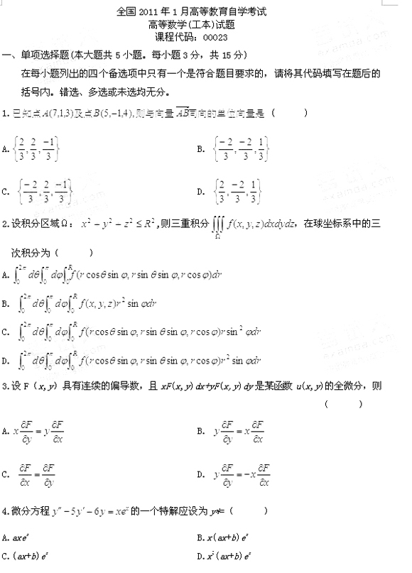 2011年1月自學考試高等數學(工本)試題
