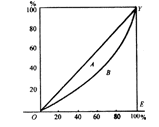 35.下圖是描述某地區(qū)的社會收入分配差異的洛倫茨曲線,假設(shè)A的面積為0.18,B的面積為0.32,試計算出該地區(qū)的基尼系數(shù)值并說明其代表的含義。
