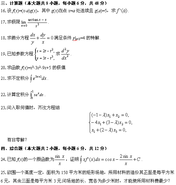 高等數(shù)學(xué)(工專)試題