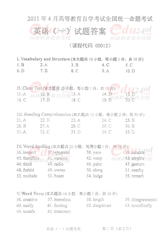 全國2011年4月自學考試英語(一)試題答案