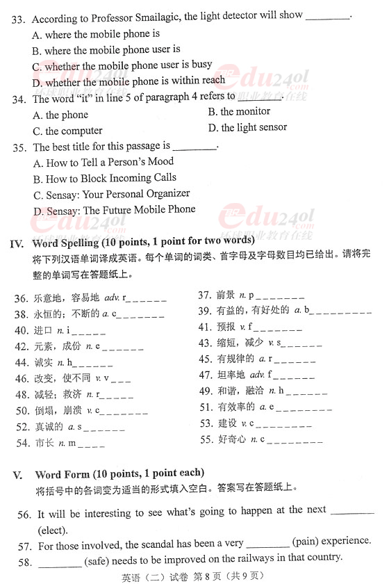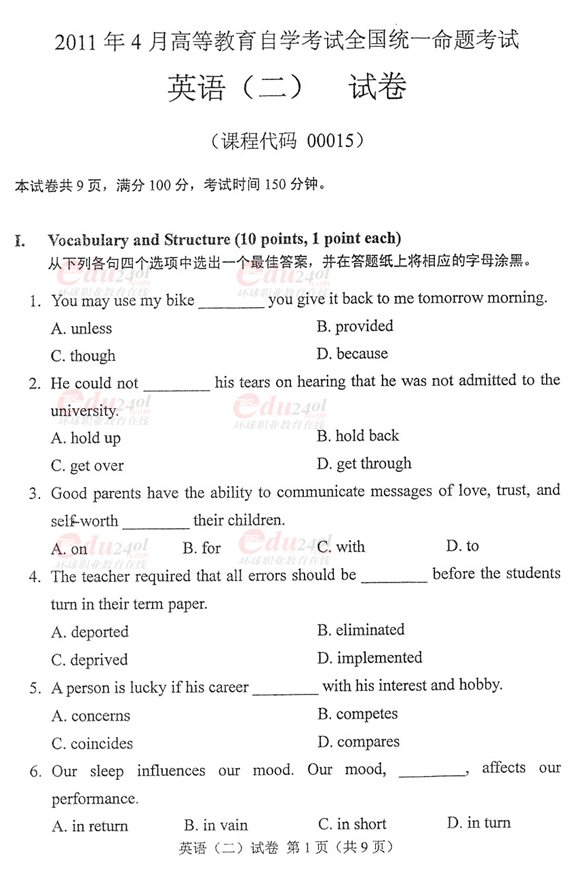 當前位置: 首頁 > 自學考試 > 自學考試歷年試題 > 全國2011年4月自學考試英語(二)試題