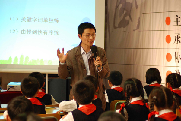 “博學多才單項優秀自考生”周益民正在給孩子們上課