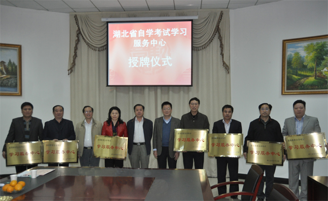 會議宣布了“湖北省高等教育自學考試學習服務中心”設置決定,舉行了簡潔的授牌儀式。徐澤貴同志為孝感學院、黃岡師范學院、武漢長江工商學院、湖北科技培訓學院、武漢電子專修學院、湖北澳新教育專修學院、武漢震旦法商專修學院等7家獲得“湖北省高等教育自學考試學習服務中心”的單位授予了銅牌,并頒發了證書。