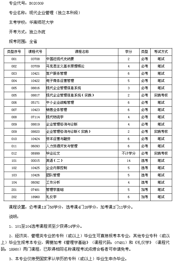 廣東2013年華南師范大學現代企業管理(本科)考試計劃