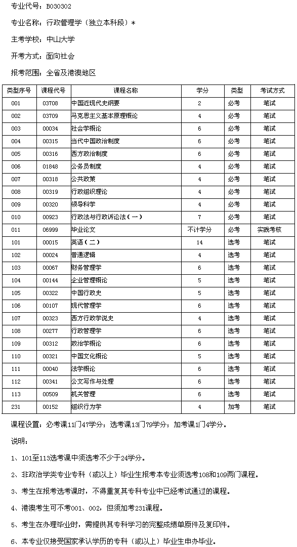 摘要 廣東2013年中山大學行政管理學(本科)考試計劃