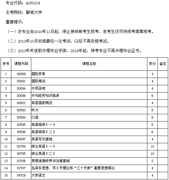山東省2013年聊城大學自考外貿(mào)英語專業(yè)(專科)課程設(shè)置表